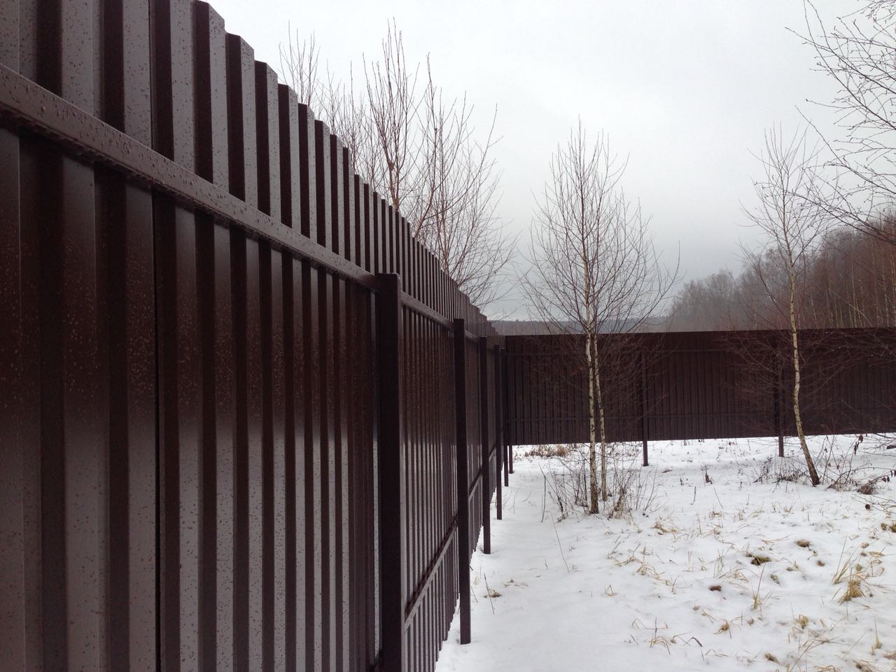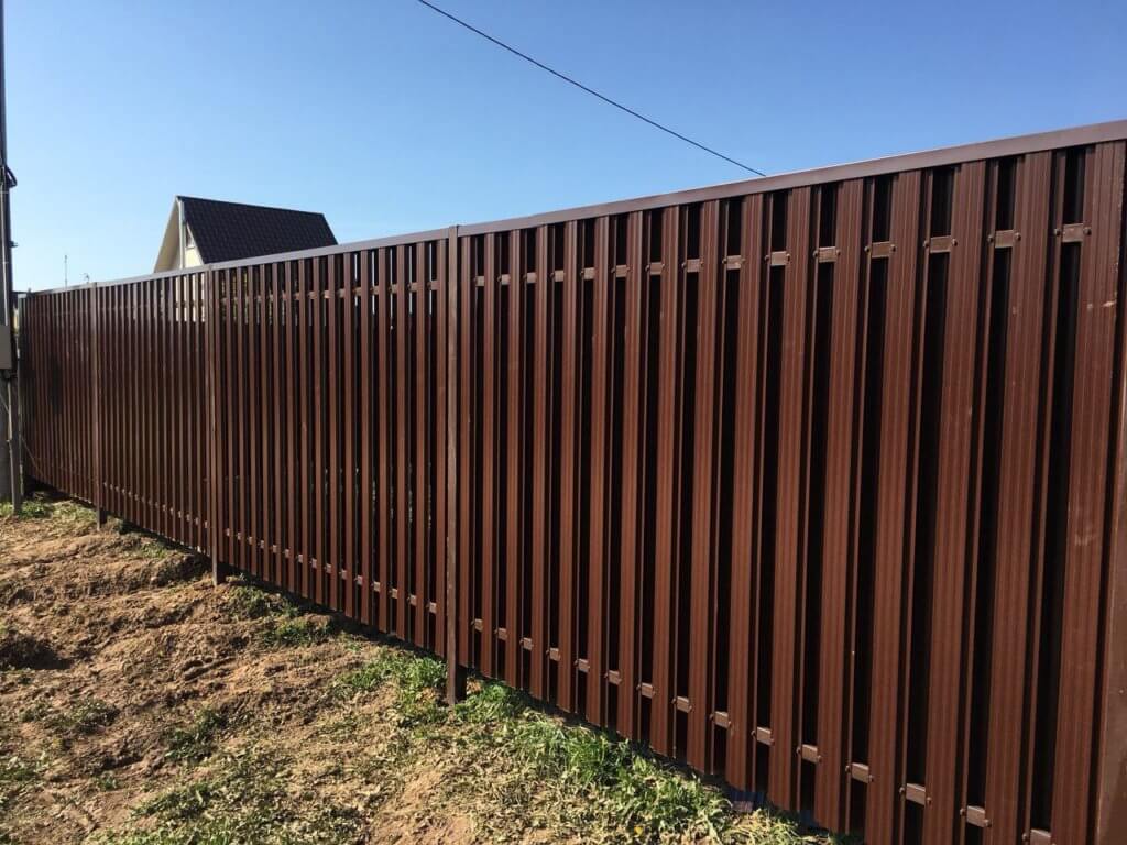 Для участков не более 10 соток подойдет забор из евроштакетника, а для более обширных территорий идеально подойдет ограждение из профнастила (металлопрофиля).